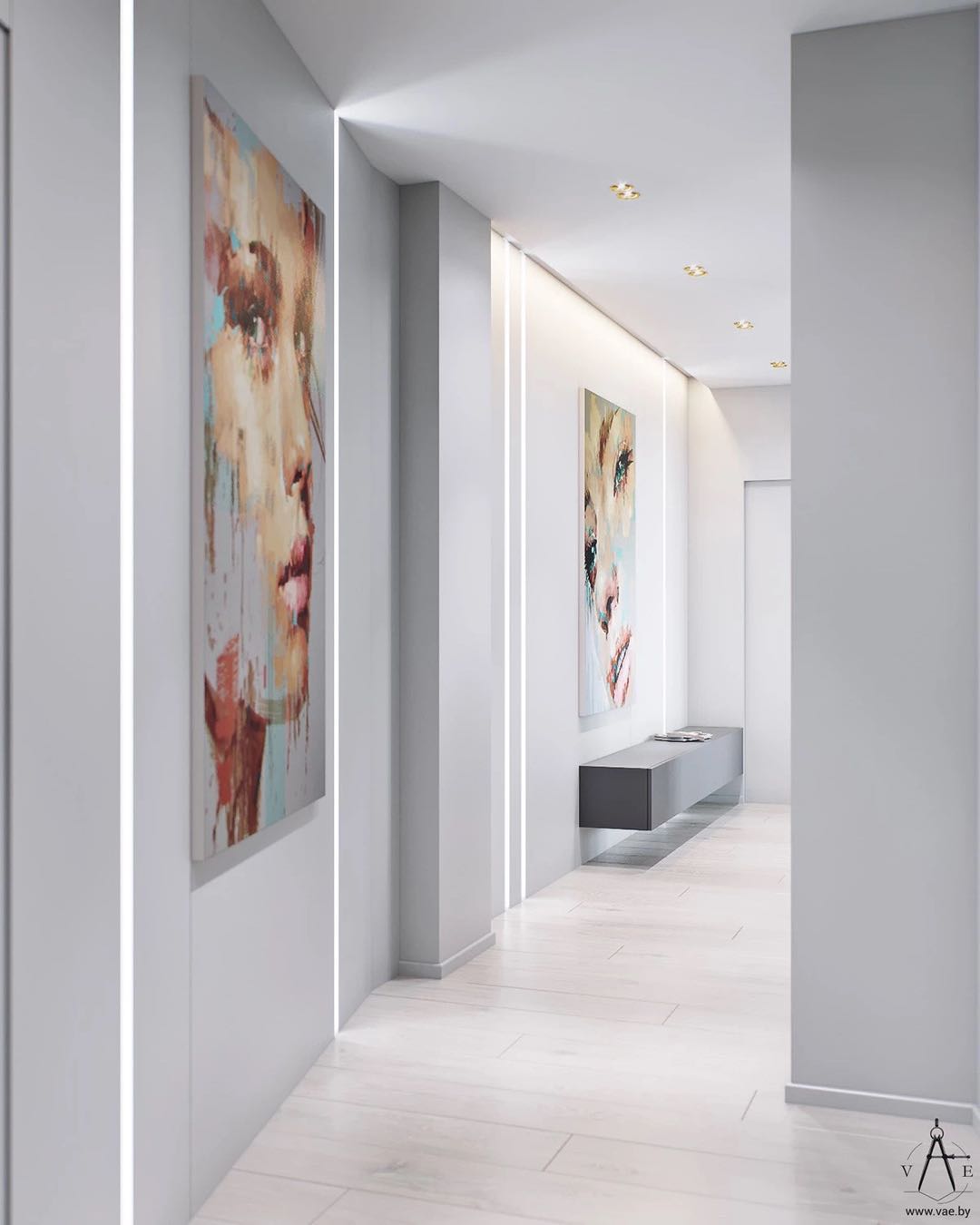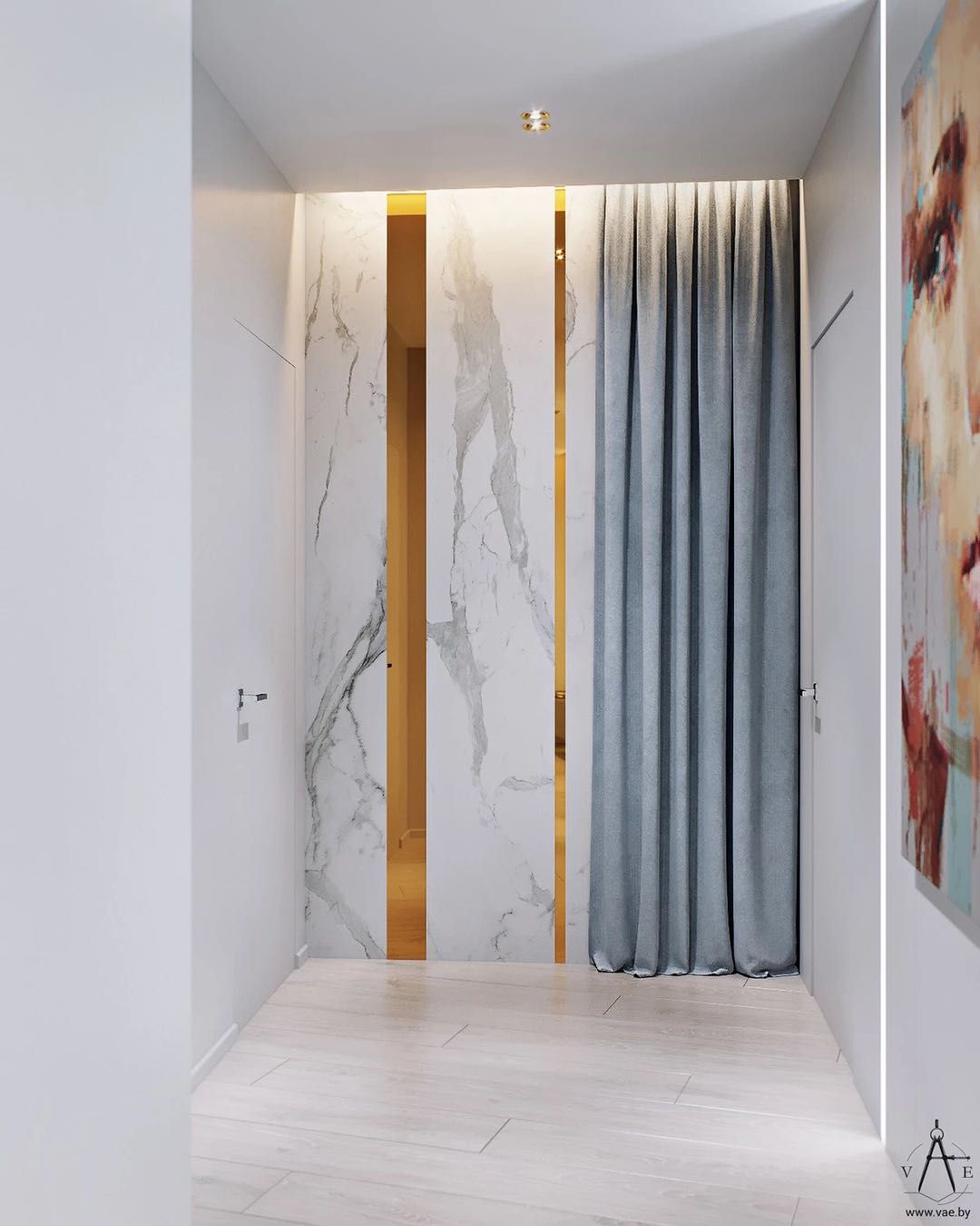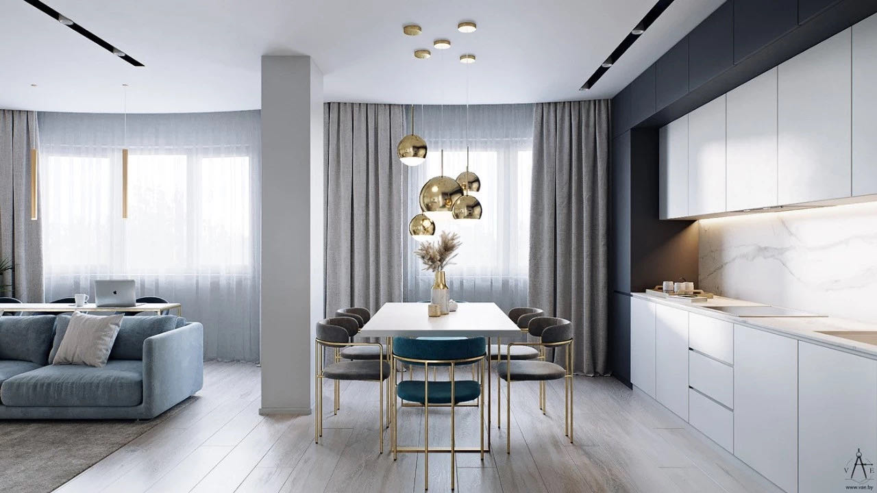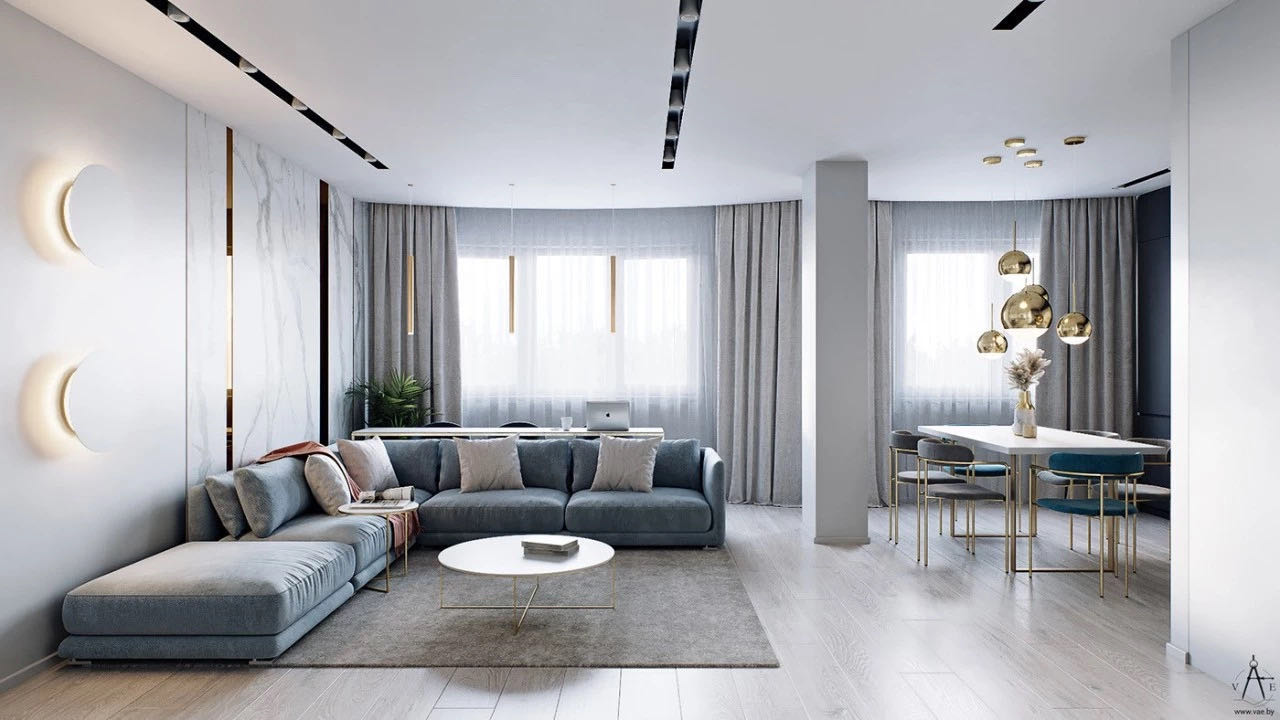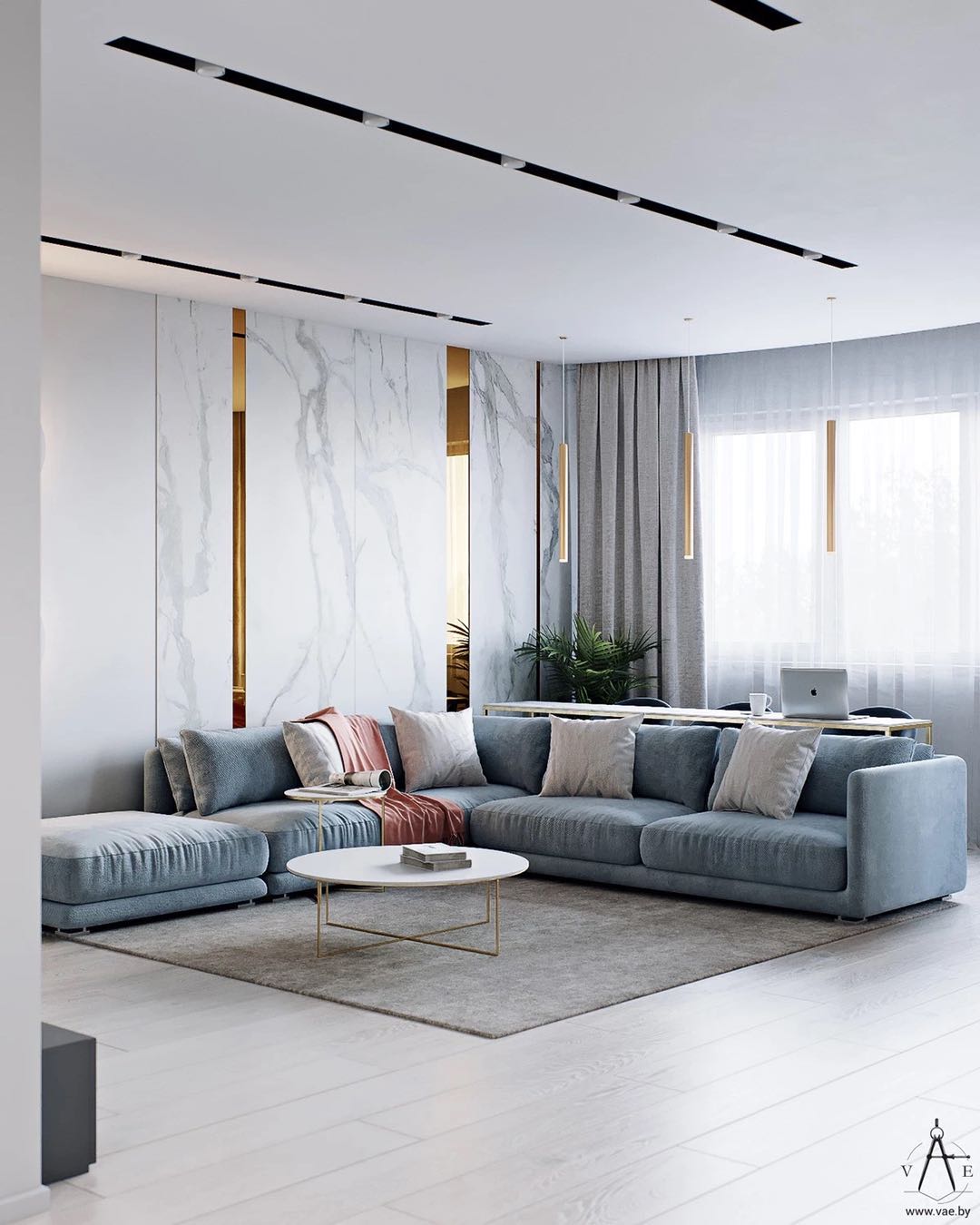 設計理念: 開放式客廳,整個空間簡潔,灰白的大理石,藍色布藝沙發,木質的地板,大大的窗搭配灰色的窗簾,光線充足,餐廚在客廳的一邊,沒有隔斷,黃銅的點綴非常搶眼,時尚輕奢,色彩協調