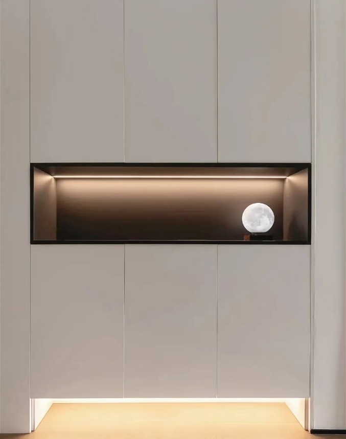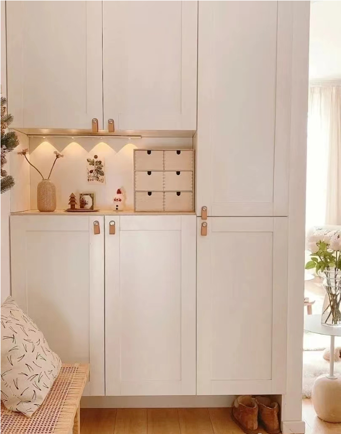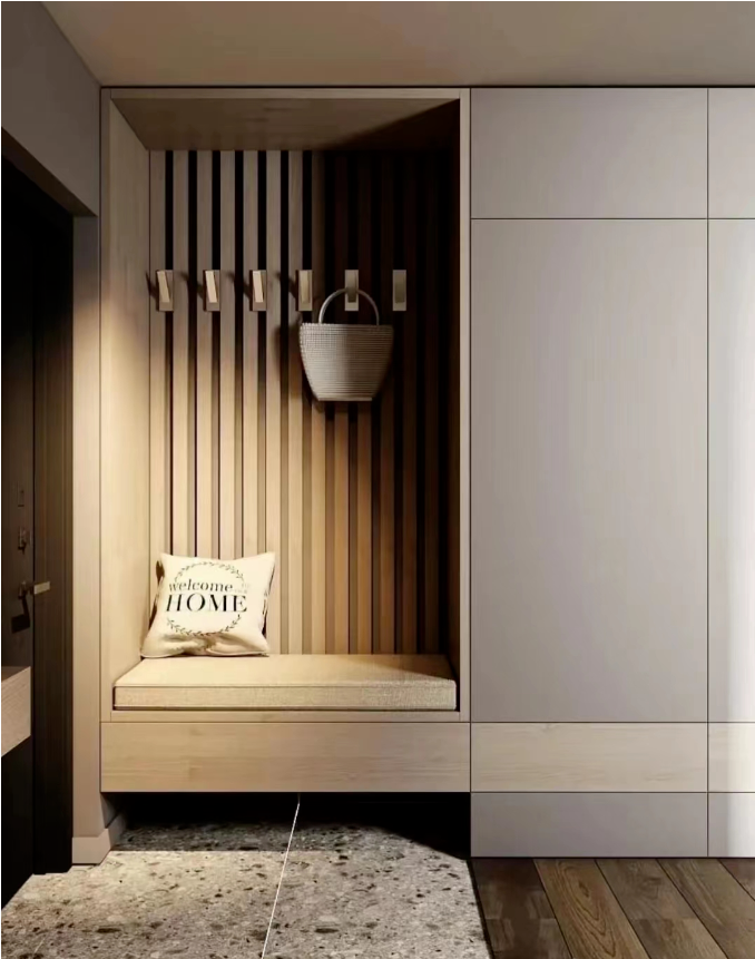 我們的入戶空間如果是做定制玄關(guān)柜,別忘了在底部預(yù)留10cm-30cm的懸空空間。這樣設(shè)計方便進出時放置一些常用的鞋子,節(jié)省時間還能讓空間更整潔。