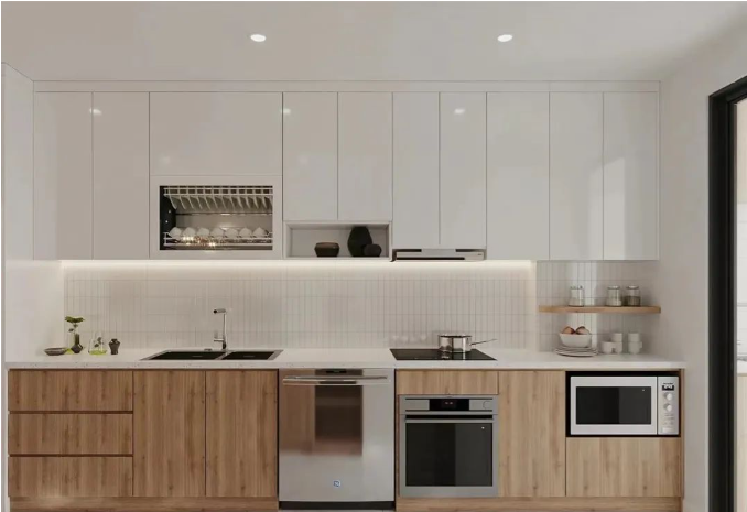 按照我們做菜的習(xí)慣來設(shè)計,可以參考:冰箱(取出)——水池(清洗)——備案臺(切)——灶臺(炒)——臺面(盛)。簡稱“備->洗->切->炒”四點,將廚房分為:水槽區(qū)、切菜區(qū)、炒菜區(qū),一條流水線排列。