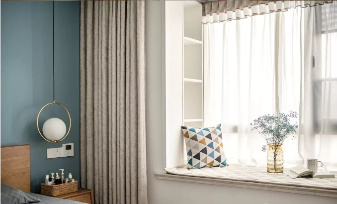 臥室飄窗是一個很好的休閑之處,因為有大面積的玻璃,視野很好,采光也很好,可以在這里靜看窗外風景,曬太陽休閑都是不錯的選擇。