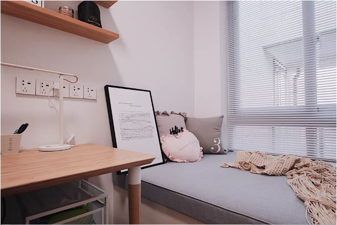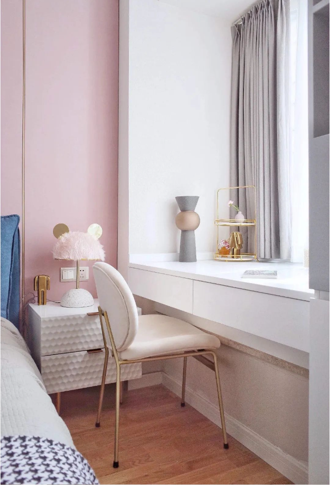 例如,在飄窗上安裝一個簡易的書桌和書架,將其變成一個小型的工作區,還可以結合梳妝臺功能進行一體設計。