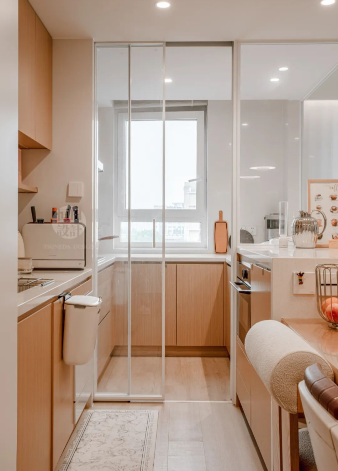 用玻璃隔開中廚區,視線無阻礙,交流、互動時刻發生。島臺內凹20cm,用餐時會舒適很多。