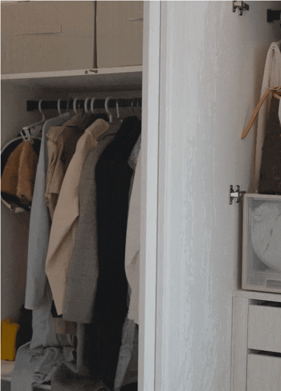 入戶處,沿墻精心打造了一條5.5米長的超薄鞋柜,巧妙劃分玄關落塵區,專為鞋履與次凈衣物設計。柜內層板高度可自由調節,提升了儲物的靈活性與便利性。