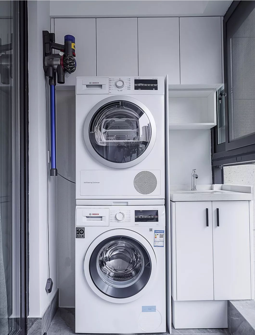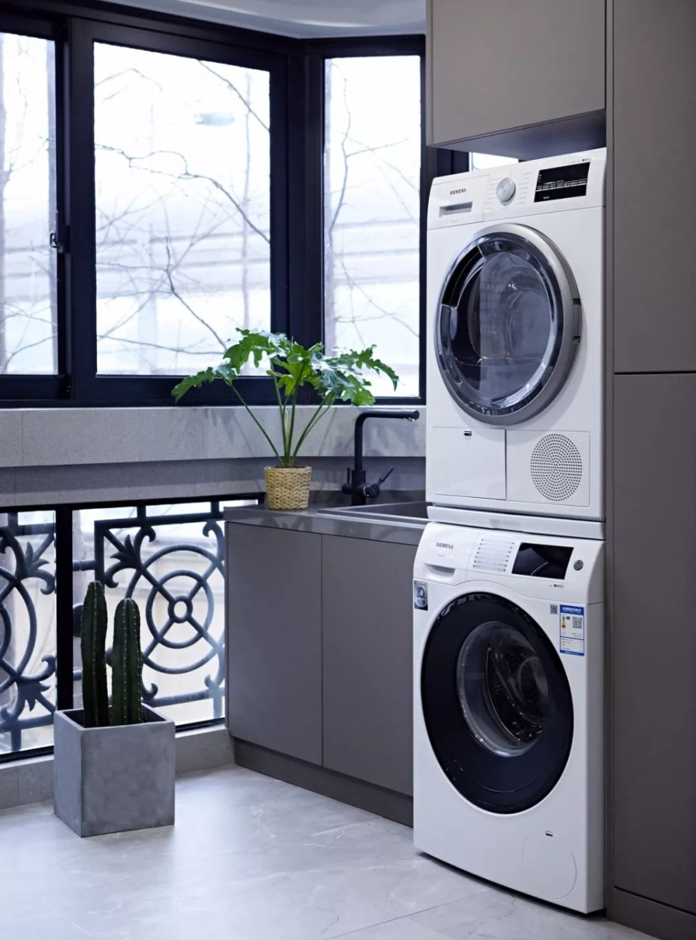 考慮嵌入式設(shè)計(jì):若計(jì)劃安裝嵌入式洗衣機(jī),需在裝修前提前預(yù)留好足夠的空間并確認(rèn)洗衣機(jī)型號(hào)與尺寸。確保洗衣機(jī)能夠順利嵌入陽臺(tái)柜中,既美觀又節(jié)省空間。